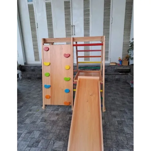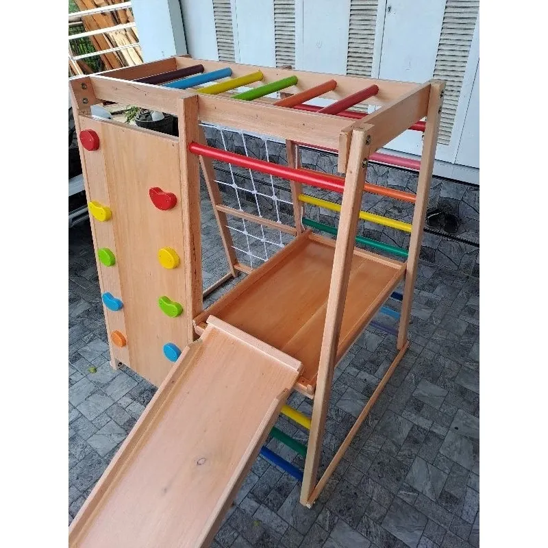 Mainan berkonsep gymnastic play aman dengan finishing tanpa cat, natural kayu