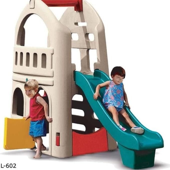 Perosotan besar dilengkapi tangga memanjat dan balkon diatas area rumah rumahan dengan pintu mungil di bagian bawah.