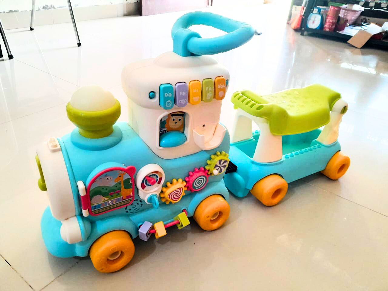 Mainan dengan 4 fungsi exercise: Baby Walker: membantu melatih anak belajar jalan, lepaskan wagon / gerbong Role Play Fun education : smiling face clock, funny window, light switch, colourful keys, digital phone, musical flip page, train barometer, 3 color square, block panel, funny gear Pull Along Wagon: tarik gerbong untuk area penyimpanan mainan kesukaan anak seperti balok atau boneka , hal ini membangun keterampilan motorik anakÂ